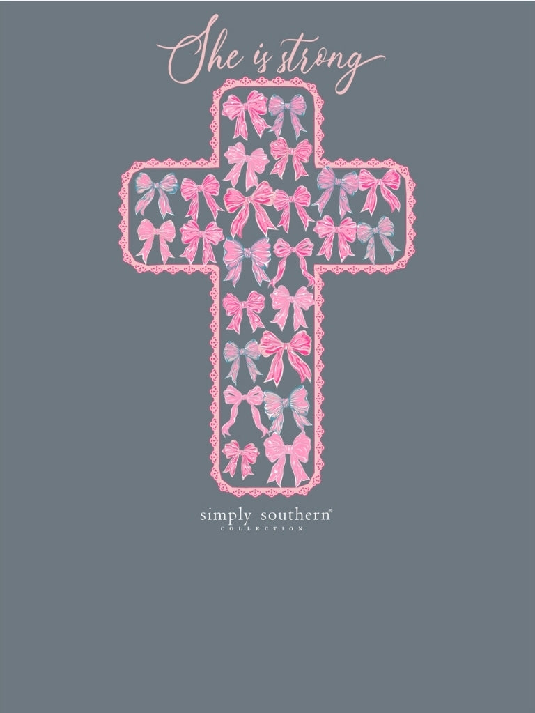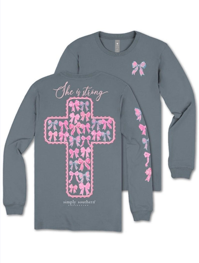 Mirage long sleeve shirt with the phrase 'She is strong' and a cross filled with hair bows. Simply Southern logo below. Hair bows on left chest and along right sleeve. 100% cotton. Unisex sizing.