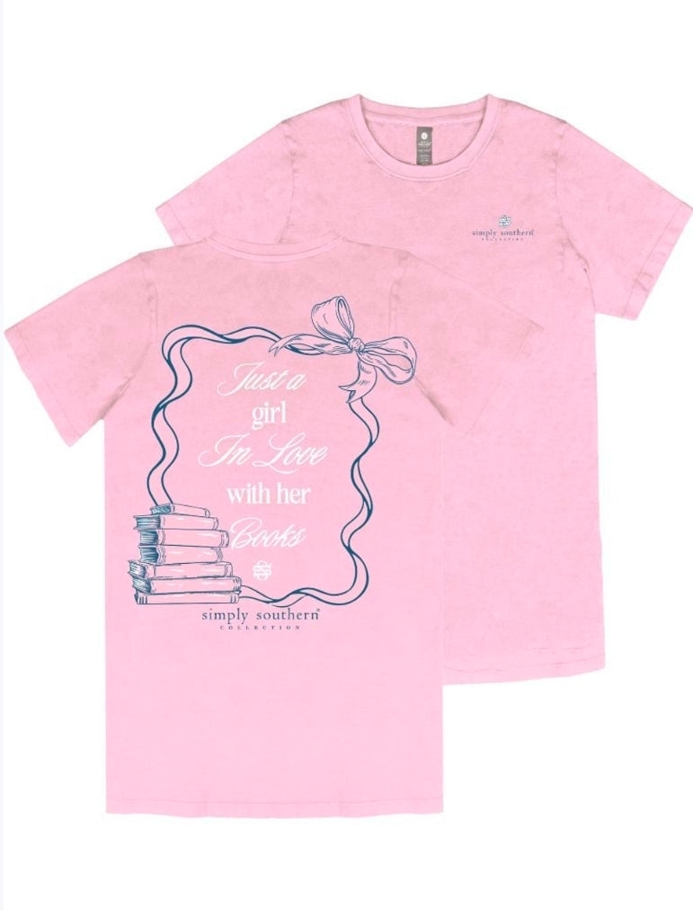 Mineral washed pink short sleeve shirt with the phrase 'Just a girl in love with her books' bordered by ribbon and a stack of books. Simply Southern logo below and on left chest. 100% cotton. Unisex sizing.